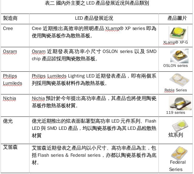 目前LED產(chǎn)品發(fā)展的趨勢,可從LED各封裝大廠近期所發(fā)表的LED產(chǎn)品功率和尺寸觀察得知,高功率、小尺寸的產(chǎn)品為目前LED產(chǎn)業(yè)的發(fā)展重點,且均使用陶瓷散熱基板作為其LED晶粒散熱的途徑。因此,陶瓷散熱基板在高功率,小尺寸的LED產(chǎn)品結(jié)構(gòu)上,已成為相當(dāng)重要的一環(huán),以下表二即為國內(nèi)外主要之 LED產(chǎn)品發(fā)展近況與產(chǎn)品類別作簡單的匯整。