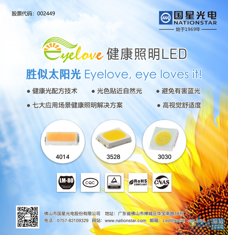 去年10月,國(guó)星光電在國(guó)內(nèi)推出Eyelove品牌健康照明LED,受到國(guó)內(nèi)外客戶廣泛關(guān)注,并以其優(yōu)異性能得到了市場(chǎng)青睞和行業(yè)認(rèn)可,曾榮獲國(guó)內(nèi)首批健康照明部品、高工LED年度創(chuàng)新技術(shù)與產(chǎn)品最高獎(jiǎng)、“2018年度中國(guó)健康型功率器件創(chuàng)新獎(jiǎng)”等多項(xiàng)榮譽(yù),成為健康照明光源器件的首選或指定品牌。
