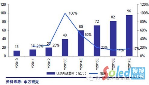 圖:2010-2015年中國LED外延芯片產(chǎn)值規(guī)模及預(yù)測