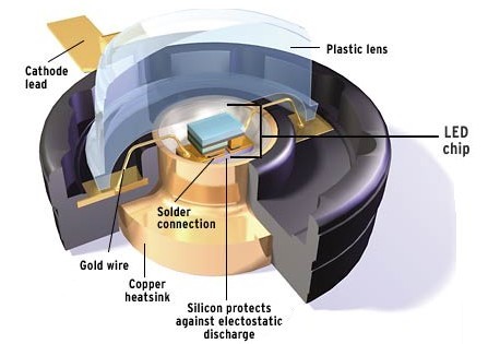 LED(Light Emitting Diode),發(fā)光二極管,是一種固態(tài)的半導(dǎo)體器件,它可以直接把電轉(zhuǎn)化為光。LED的心臟是一個半導(dǎo)體的晶片,晶片的一端附在一個支架上,一端是負(fù)極,另一端連接電源的正極,使整個晶片被環(huán)氧樹脂封裝起來。半導(dǎo)體晶片由兩部分組成,一部分是P型半導(dǎo)體,在它里面空穴占主導(dǎo)地位,另一端是N型半導(dǎo)體,在這邊主要是電子。但這兩種半導(dǎo)體連接起來的時(shí)候,它們之間就形成一個“P-N結(jié)”。當(dāng)電流通過導(dǎo)線作用于這個晶片的時(shí)候,電子就會被推向P區(qū),在P區(qū)里電子跟空穴復(fù)合,然后就會以光子的形式發(fā)出能量,這就是LED發(fā)光的原理。而光的波長決定光的顏色,是由形成P-N結(jié)材料決定的。如圖所示,LED由LED支架、芯片、透鏡等組成,LED支架為LED的重要組成部分。