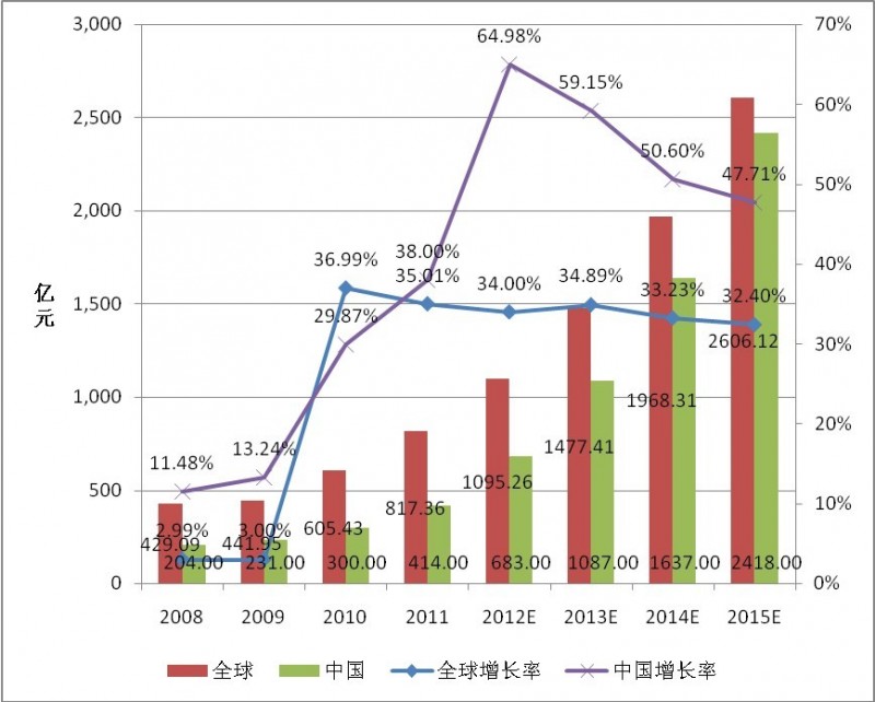 圖表2全球及中國LED產(chǎn)值逐年增長
