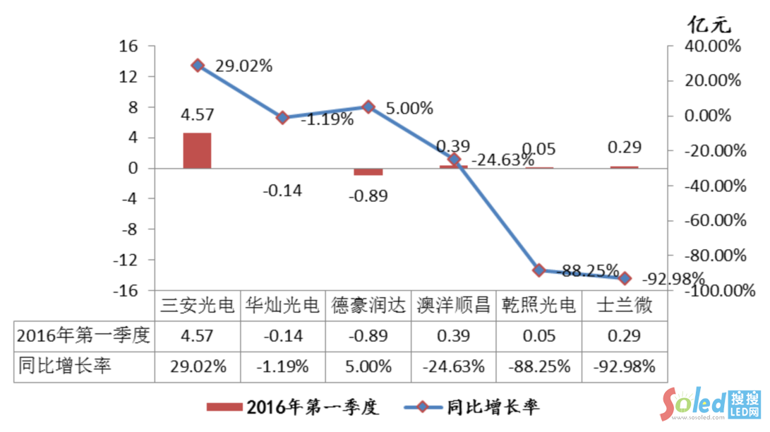 其中,一季度三安光電LED芯片毛利下降,綜合毛利率比上年同期綜合毛利率降低約9個百分點。士蘭微和乾照光電一季度芯片業(yè)務(wù)利潤同比降幅最大,均超過80%。