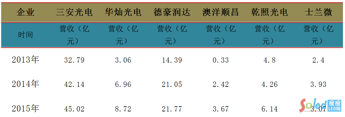 圖表:2013-2015年六家LED芯片上市公司業(yè)務(wù)收入情況對比