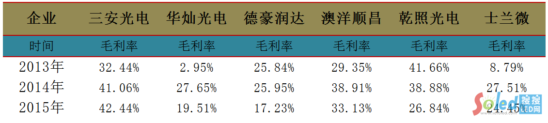 2015年以來LED芯片企業(yè)營收增速放緩,產(chǎn)品毛利不斷降低。2015年六家LED芯片上市公司除三安光電毛利率提高了1.68%以外(包括應(yīng)用產(chǎn)品業(yè)務(wù)營收),其他五家企業(yè)毛利率都不同程度降低。