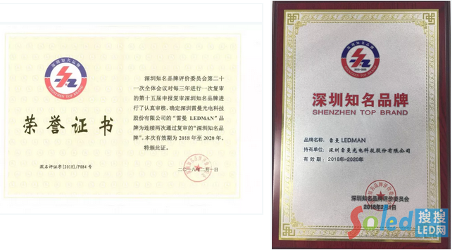 第十五屆“深圳知名品牌”評價(jià)活動于2017年3月28日正式啟動, 2018年1月19日,深圳知名品牌評價(jià)委員會對第十五屆“深圳知名品牌”評價(jià)活動,完成企業(yè)申報(bào)、企業(yè)內(nèi)部管理體系現(xiàn)場評審、社會公眾投票、行業(yè)專家評價(jià)和品牌價(jià)值評估工作,評價(jià)委全體會議進(jìn)行了審議評選。經(jīng)深圳市公證處現(xiàn)場公證,確定認(rèn)定和入選了8個(gè)品牌為第四屆“國際信譽(yù)品牌”, 56個(gè)品牌為第十五屆“深圳知名品牌”,169個(gè)品牌通過深圳知名品牌復(fù)評。深圳雷曼光電科技股份有限公司“雷曼 LEDMAN”品牌為連續(xù)兩次通過復(fù)審的“深圳知名品牌”。