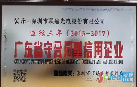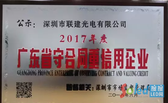 實(shí)至名歸|聯(lián)建光電再獲2017年度“廣東省守合同重信用企業(yè)”稱號(hào)