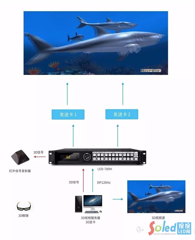 2、  配合3D顯卡輸出的3D信號,做同步功能的調(diào)節(jié),確保3D眼鏡的開關(guān)與LED屏顯示的圖像匹配;