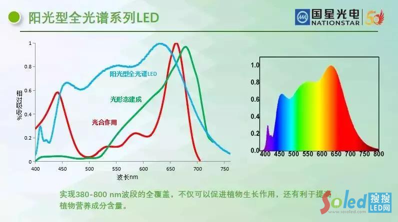 陽光型全光譜系列LED,實現(xiàn)380-800 nm波段的全覆蓋,不僅可以促進(jìn)植物生長作用,還有利于提高植物營養(yǎng)成分含量。