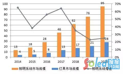2014-2020年全球植物照明市場規(guī)模、增速及預(yù)測(單位:億元、%)