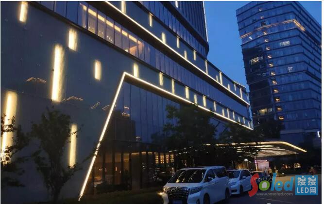 在避難層用洗墻燈照亮頂部,為建筑在夜景增加兩條靈動的燈光飄帶,創(chuàng)造建筑豐富的燈光層次感。