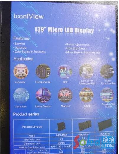 易美芯光與韓國(guó)的Lumens共同開(kāi)發(fā)出點(diǎn)間距從2.0mm到0.55mm的Micro LED 顯示技術(shù),本次展示的Micro LED顯示器IconiView,基于Flip-Chip-on-Module (COM)技術(shù),并結(jié)合點(diǎn)陣驅(qū)動(dòng)與影像處理算法的LED芯片,達(dá)到1,570,900 pixel/m2。其對(duì)比度超過(guò)3000:1,亮度則達(dá)到2000nit。