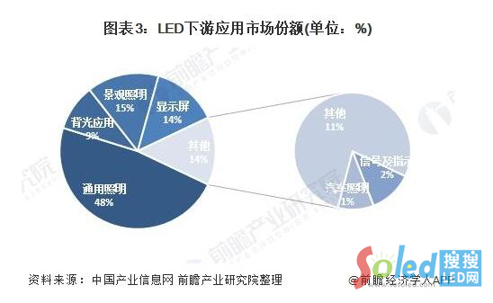鑒于LED的自身優(yōu)勢,目前,LED封裝產(chǎn)品已廣泛地應用在指示、背光、顯示、照明等應用方向,應用領域涵蓋消費類電子業(yè)、汽車業(yè)、廣告業(yè)、交通業(yè)、體育業(yè)、娛樂業(yè)、建筑業(yè)等全方位領域。照明是終端市場應用最廣泛的產(chǎn)品,通用照明占47.7%的市場份額,景觀照明占14.9%的市場份額,汽車照明占1.4%的市場份額。顯示是終端市場的第二大產(chǎn)品,具有13.6%的市場份額。另外,背光應用占比9.6%,剩下的信號指示燈和其他應用產(chǎn)品分別占比1.4%和11%。