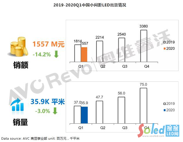 突如其來的新冠肺炎疫情給國內(nèi)經(jīng)濟帶來嚴(yán)重的影響,一季度國內(nèi)GDP同比下降6.8%,各行各業(yè)都受到了不同程度的損失。受疫情影響,2020年一季度小間距LED銷額15.6億元,同比下降14.2%,銷售面積35.9K平米,同比下降3%。