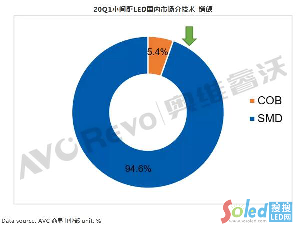 從封裝技術(shù)來看,主流封裝還是SMD技術(shù),一季度SMD封裝產(chǎn)品銷額占比94.6%,COB產(chǎn)品銷額市場占比5.4%,COB產(chǎn)品的客戶集中在政府部門的中高端用戶,一季度市場份額略有下滑,但隨著市場的恢復(fù),1.0以下市場需求增加,4月份COB訂單開始回暖。