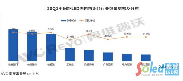 從行業(yè)來看,大政府(政府部門、公共服務(wù)、公檢法)依然是小間距LED的主要應(yīng)用領(lǐng)域。2020年一季度從銷售面積來看,政府部門、公共服務(wù)、公檢法銷售面積略有增長,下降幅度較大的是工商業(yè),工商業(yè)包含了零售、酒店、金融、保險等范圍,一季度受疫情影響較大,同比大幅下滑。