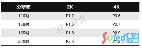 圖注:LED會(huì)議一體機(jī)不同分辨率下大概對(duì)應(yīng)的點(diǎn)間距