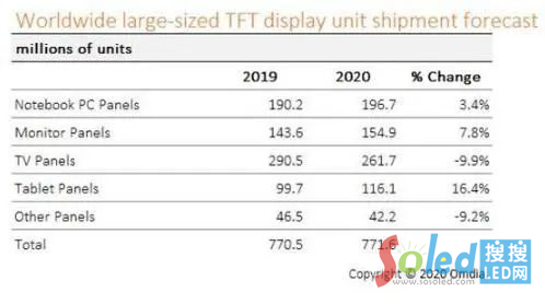 Omdia上周也指出,大尺寸面板市場(chǎng)開始復(fù)蘇。預(yù)計(jì)2020年全球大尺寸面板出貨量將達(dá)7.716億片,比2019年的7.705億片增長不到1%,這個(gè)數(shù)據(jù)包括9英寸及以上的LCD(液晶)和OLED面板。本年度的增長總量持平,上半年面板市場(chǎng)及全球經(jīng)濟(jì)劇烈變化,下半年相比可能會(huì)有很大不同。