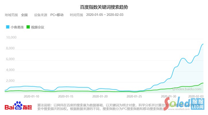 透過(guò)百度指數(shù)視頻會(huì)議相關(guān)的企業(yè)搜索指數(shù)暴增,以后起之秀小魚易連為例,日常平均搜索指數(shù)1000多,1月25日后直線暴增達(dá)9000多。