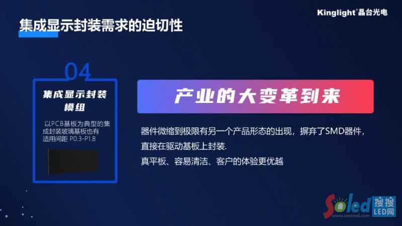龔浩然介紹,集成顯示封裝技術(shù)方案已基本成熟,在微間距時代下分立器件小間距屏第一痛點是可靠性, 集成顯示封裝能夠有效改善這一痛點,將帶來顯示產(chǎn)業(yè)的大變革。從本質(zhì)上講,微距顯示核心問題還是封裝技術(shù),當(dāng)前缺的不是市場,而是封裝技術(shù),晶臺將積極布局加大技術(shù)研發(fā)投入,配合客戶實現(xiàn)項目落地。他預(yù)估到2030年,集成顯示封裝產(chǎn)品有100倍左右的增長,即1500億左右市場規(guī)模, 復(fù)合增長率超50%以上。