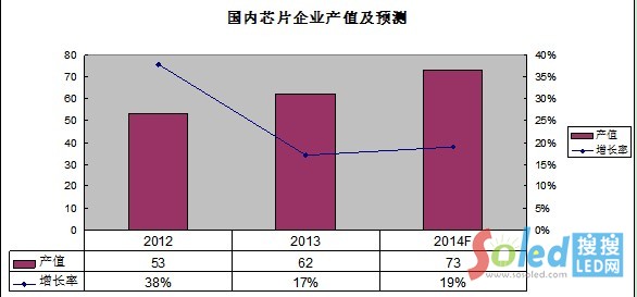 圖表中數(shù)據(jù)來源為TrendForce統(tǒng)計。據(jù)統(tǒng)計與預測2013年國內(nèi)本土企業(yè)LED芯片產(chǎn)值為62億元人民幣,年增17%。2013年LED商業(yè)照明滲透率快速提升拉抬芯片產(chǎn)能利用率,但是由于LED芯片價格持續(xù)下降,導致產(chǎn)值的增速幅度不如產(chǎn)量,預計2014年將以相同成長幅度,推升產(chǎn)值達73億元人民幣。2013年上半年LED商業(yè)照明市場需求強勁,傳統(tǒng)照明加快轉(zhuǎn)型速度,中游封裝廠商紛紛向下游照明整合,導致上半年中功率照明芯片一度出現(xiàn)斷貨現(xiàn)象。