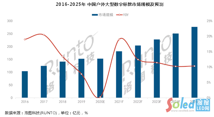戶外大型數(shù)字標(biāo)牌在我國(guó)起步較晚,尤其LED大屏的發(fā)展是伴隨2008年奧運(yùn)會(huì)舉辦而活躍,隨后進(jìn)入蓬勃發(fā)展期。受益于“夜經(jīng)濟(jì)”的興起和新基建政策的拉動(dòng),預(yù)計(jì)未來(lái)五年,戶外大型數(shù)字標(biāo)牌市場(chǎng)的每年增長(zhǎng)率保持在10%以上,2025年市場(chǎng)規(guī)模達(dá)270億元以上。