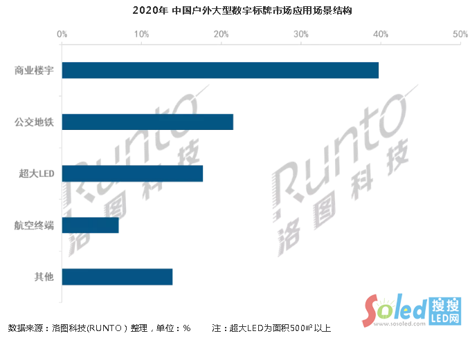 據(jù)洛圖科技(RUNTO)調(diào)研,戶外大型數(shù)字標(biāo)牌主要應(yīng)用在商業(yè)樓宇的信息發(fā)布上,比重接近40%。公交地鐵對(duì)戶外數(shù)字標(biāo)牌的需求次之,占比超20%。