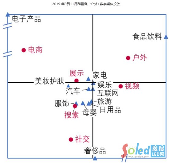 戶外媒體在2019年具有較強的獨立性:在媒介屬性上來看,與社交、電商兩類數字媒體可以形成投放需求互補,即視覺獨占類展示廣告(廣覆蓋)-社交(特定群體投放)-電商(購買渠道)進行廣告投放,因此我們看到不同行業(yè)的客戶因行業(yè)性質不同,針對各自需求產生不同偏好。