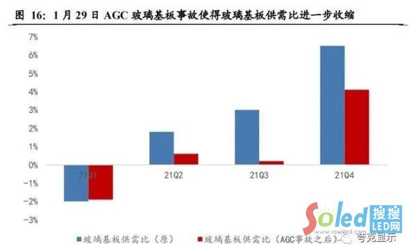從節(jié)奏上看,2021年二季度京東方B17持續(xù)爬坡,惠科長沙線于2月實(shí)現(xiàn)量產(chǎn)后也在持續(xù)爬坡,供應(yīng)端是存在一定邊際增量的,但由于1月底AGC玻璃基板供應(yīng)中 斷事件影響,友達(dá)、群創(chuàng)、惠科 3 月起來自旭硝子玻璃基板供應(yīng)受到影響(友達(dá)、群創(chuàng)6代玻璃基板供應(yīng)量將減少 30%,而惠科位在重慶和滁州 8.6 代廠,其玻璃基板也將減少30%的供貨量),新增的供給并非供需平衡下的壓力,更多地僅僅是供 給緊張狀態(tài)的緩解,實(shí)際的新增壓力在 AGC 玻璃基板供應(yīng)恢復(fù)后可能會得到顯現(xiàn)。