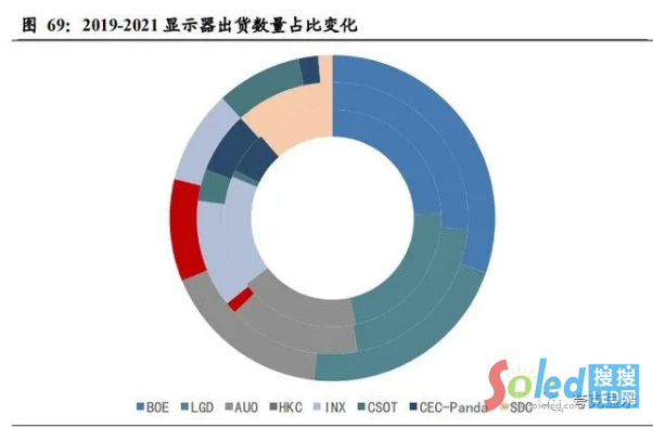 對京東方而言,作為顯示器面板領(lǐng)域的龍頭廠商,在并購中電熊貓(CEC Panda)以后,其市場地位將獲得明顯提升,預(yù)計2021年其合并后的市場份額合計將可達(dá)到 33%,較 2020 年提升7個百分點(diǎn),在三星顯示的退出過程中,迅速占據(jù)更多電競、高分辨率等增值細(xì)分市場的份額,并擴(kuò)大 IPS 在中高端市場競爭優(yōu) 勢也是其2021年的擴(kuò)張路線之一。