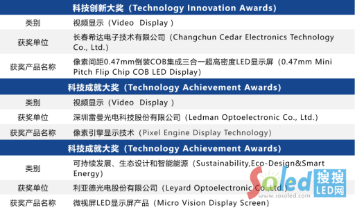 “2021 ISLE科創(chuàng)大獎(jiǎng)”的評(píng)選原則是科技創(chuàng)新、技術(shù)突破、市場(chǎng)潛力。LED智庫評(píng)審小組根據(jù)設(shè)計(jì)、功能性、消費(fèi)者訴求、工程學(xué)及產(chǎn)品與競(jìng)爭(zhēng)對(duì)手比較的情況對(duì)參賽產(chǎn)品及展會(huì)期間關(guān)注熱度進(jìn)行綜合審核評(píng)分,在各自產(chǎn)品類別中獲得最高分的產(chǎn)品獲獎(jiǎng)。該獎(jiǎng)項(xiàng)是在ISLE 2021“顯示新星產(chǎn)品獎(jiǎng)”、“一體機(jī)創(chuàng)新產(chǎn)品獎(jiǎng)”、“顯示優(yōu)秀產(chǎn)品獎(jiǎng)“三類獎(jiǎng)項(xiàng)獲獎(jiǎng)名單的基礎(chǔ)上、觀眾展后的反饋及LED專家智庫對(duì)參評(píng)的產(chǎn)品進(jìn)行優(yōu)中擇優(yōu)。本次評(píng)選出了三家企業(yè)的產(chǎn)品獲獎(jiǎng),他們分別是: