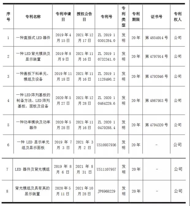 專利名稱分別是:一種直插式LED器件、一種LED背光模塊及顯示裝置、一種蓋板下料單元/模組及設(shè)備、一種LED陣列基板的制備方法/LED陣列基板/面板及設(shè)備、一種功率模塊及功率器件、一種LED顯示單元組及顯示面板、LED器件及背光模組、背光模組及具有其的顯示裝置。