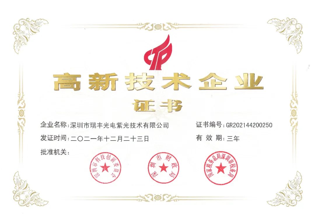 近日,瑞豐光電全資子公司深圳市瑞豐光電紫光技術(shù)有限公司(以下簡稱“瑞豐紫光”) 憑借卓越的自主創(chuàng)新能力,強大的綜合科研實力,經(jīng)過層層審核與評定,獲得深圳市科技創(chuàng)新委員會、深圳市財政局、國家稅務(wù)總局深圳市稅務(wù)局聯(lián)合頒發(fā)的《高新技術(shù)企業(yè)證書》。