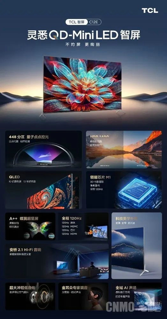 4月22日,TCL推出新品——C12E靈悉QD-Mini LED智屏。其于4月20日推出的第一臺(tái)“不忽悠年輕人的真高刷電視”T7E,在預(yù)售第一天便取得了5000臺(tái)的好成績(jī),而這款搭載了A++碟翼超顯屏的C12E靈悉QD-Mini LED智屏或?qū)⒀永m(xù)前者的佳績(jī)。