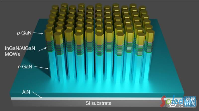 目前已經(jīng)可以制造出高效、大面積的藍(lán)色和紅色LED,但制造出高效、大面積的綠色LED非常困難,將LED組件尺寸縮減到1微米也具有挑戰(zhàn)性。而為了解決這一問(wèn)題,密歇根大學(xué)教授Zetian Mi和他的團(tuán)隊(duì)開(kāi)發(fā)了一種亞微米級(jí)的III-氮化物綠色MicroLED,其特點(diǎn)是使用了直徑僅100到200納米,間距僅幾納米的納米線陣列。