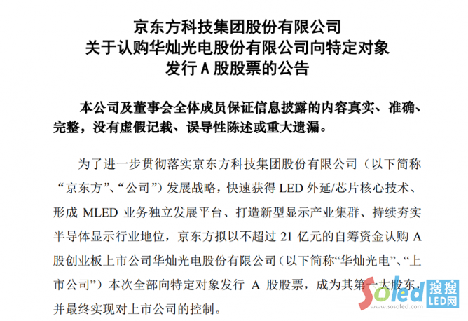 11月6日,京東方發(fā)布公告稱,擬以不超過21億元的自籌資金認購華燦光電向特定對象發(fā)行的A股股票,認購完成后將以23.08%持股比例成為該公司第一大股東。