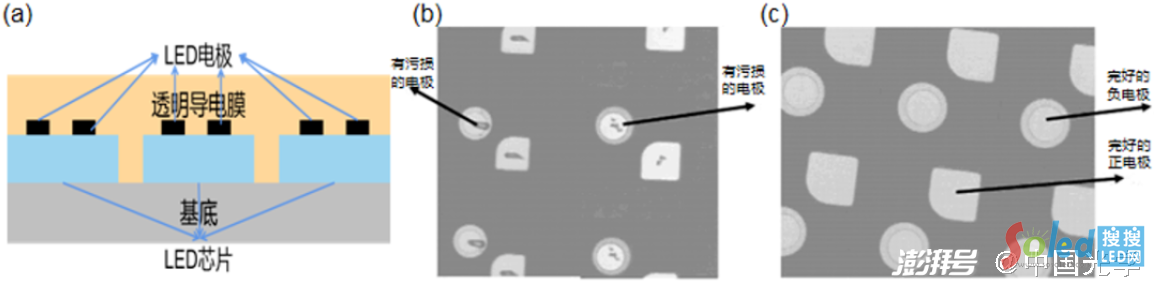 圖3:(a)采用透明導(dǎo)電膜的檢測(cè)原理示意圖;(b)針測(cè)后的LED電極光學(xué)顯微照片;(c)使用透明導(dǎo)電膜進(jìn)行針測(cè)后的LED電極光學(xué)顯微照片