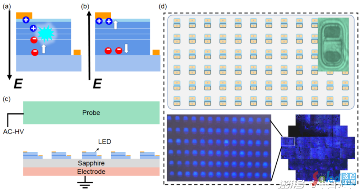 圖4:(a)無(wú)接觸Micro-LED在正向電場(chǎng)下的工作示意圖;(b)無(wú)接觸Micro-LED在反向電場(chǎng)下的工作示意圖;(c)晶圓級(jí)Micro-LED的無(wú)接觸電致發(fā)光檢測(cè)原理圖;(d)待檢測(cè)的Micro-LED陣列示意圖與Micro-LED陣列檢測(cè)效果圖