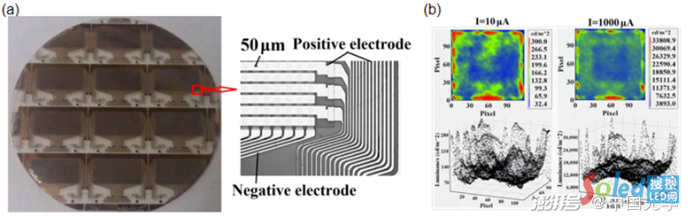 設(shè)計(jì)特殊的電極結(jié)構(gòu)并通過(guò)顯微鏡對(duì)包含多顆Micro-LED的圖像進(jìn)行處理并篩選出亮度不正常的芯片也可以提高檢測(cè)效率。研究人員提出了一種可以測(cè)量整個(gè)Micro-LED陣列乃至單顆Micro-LED芯片表面亮度分布的檢測(cè)方法。Micro-LED陣列(如圖2(a)所示)由行列電極進(jìn)行選通,因而可以滿足單個(gè)Micro-LED芯片點(diǎn)亮和多個(gè)Micro-LED芯片同時(shí)點(diǎn)亮需求,并在兩種不同情況下使用測(cè)量系統(tǒng)進(jìn)行檢測(cè)。攝像系統(tǒng)獲取發(fā)光的Micro-LED陣列圖像并由算法系統(tǒng)生成偽彩色圖(如圖2(b)所示),從偽彩色圖可以看出,隨著電流密度增大,Micro-LED表面亮度的均勻性增大。這個(gè)方法在檢測(cè)方面可以精確地表征單顆LED芯片的亮度均勻性情況,也可以同時(shí)表征多顆LED芯片的亮度均勻性情況。不足之處是制作多行多列的電極成本較高,且后期還需要去除這些過(guò)渡性的電極。
