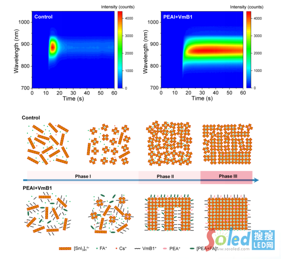 為此,黃維院士、王建浦教授、王娜娜教授、常進(jìn)副教授團(tuán)隊利用原位光譜表征技術(shù),揭示了錫基鈣鈦礦薄膜生長初期(10秒內(nèi))晶粒的快速聚集是缺陷態(tài)形成的主要原因。進(jìn)而發(fā)現(xiàn),通過在鈣鈦礦前驅(qū)體溶液中引入與碘化亞錫有強(qiáng)化學(xué)作用的一類添加劑(以維生素B1為代表),可以有效抑制鈣鈦礦晶粒的快速聚集,減少鈣鈦礦晶體生長過程中發(fā)光猝滅中心的形成。