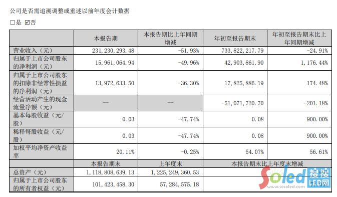其中,第三季度營收2.31億元,同比下降51.93%;凈利潤1596萬元,同比下降49.96%。