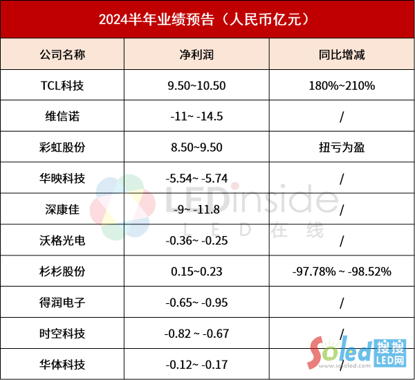核心提示:近日,10家LED、面板相關(guān)企業(yè)發(fā)布了2024年上半年業(yè)績預告,由于市場需求不佳,行業(yè)競爭激烈等緣故,多家企業(yè)預計凈利潤下滑或持續(xù)虧損。另一方面,TCL科技凈利潤預增長,彩虹股份扭虧為盈。