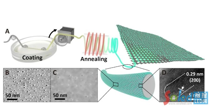 為了解決這些難題,港科大電子及計算機工程學(xué)系和化學(xué)及生物工程學(xué)系講座教授范智勇的研究團隊采用了一個新穎的方法,在薄鋁纖維上使用多孔鋁膜模板。多孔鋁膜具有約5納米的超小孔徑,MPH前驅(qū)體溶液通過卷對卷溶液涂布技術(shù)注入多孔鋁膜,隨后進行退火程序,以達致空間均勻的溶劑蒸發(fā)和MPH的結(jié)晶。這個方法令鈣鈦礦量子線陣列能均勻生長,并大大減低了多孔鋁膜表層上多余的薄膜結(jié)構(gòu)的形成。