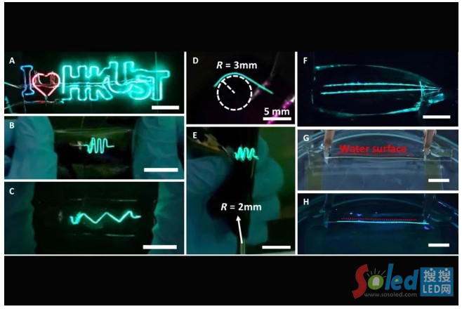 研究團隊成功制成了發(fā)射峰值分別為625納米(紅色)、512納米(綠色)和490納米(天藍色)的纖維發(fā)光二極管。這些二極管展現(xiàn)出良好的彎曲性和延展性,使其適用于紡織照明的應(yīng)用。研究團隊并制作了多款二維和三維的結(jié)構(gòu),包括二維全彩字符串「I  HKUST」,它們均具有出色的熒光均勻性。此外,他們又利用能產(chǎn)生漸變顏色的鹵化物鈣鈦礦量子線制作了維多利亞港的「夜景」,突顯了纖維發(fā)光二極管的多功能性和美學(xué)潛力。