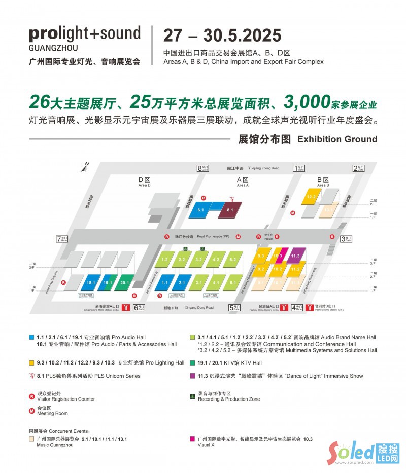 2025廣州展首次橫跨展館的ABD三大展區(qū),展會(huì)不但實(shí)現(xiàn)了規(guī)模上的再次突破,更致力在參展效益與展會(huì)質(zhì)量上不斷提升。其中A區(qū)是通訊及會(huì)議系統(tǒng)、多媒體系統(tǒng)方案以及專(zhuān)業(yè)音響設(shè)備的前沿陣地。B區(qū)則匯聚了眾多專(zhuān)業(yè)燈光、舞臺(tái)機(jī)械、沉浸式互動(dòng)、文旅照明以及數(shù)字光影等相關(guān)產(chǎn)品,首次啟用的D區(qū)將重點(diǎn)打造為KTV相關(guān)設(shè)備、娛樂(lè)場(chǎng)景解決方案的集中展示區(qū)。同時(shí),今年全新推出的專(zhuān)業(yè)音響配件館也將在D區(qū)的18.1號(hào)館隆重登場(chǎng)。