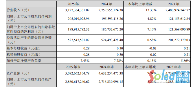 3月20日丨聚燦光電(300708.SZ)公布2025年年度報(bào)告,2025年度,公司實(shí)現(xiàn)營業(yè)收入31.27億元,同比增長13.33%,歸屬于上市公司股東的凈利潤2.05億元,同比增長4.82%,歸屬于上市公司股東的扣除非經(jīng)常性損益的凈利潤1.99億元,同比增長7.10%。從經(jīng)營成果來看,公司營業(yè)收入、歸屬于上市公司股東的凈利潤、歸屬于上市公司股東的扣除非經(jīng)常性損益的凈利潤均創(chuàng)同期歷史新高。