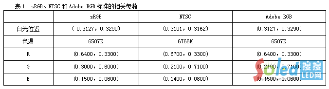 以上幾個(gè)色域標(biāo)準(zhǔn)中通用的標(biāo)準(zhǔn)主要為:sRGB、NTSC和Adobe RGB,各自的白光位置、色溫以及RGB基色的坐標(biāo)見(jiàn)表1: