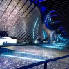 展館中央的這個巨型動態(tài)鏡面裝置,重量為6噸,立面的部分是由36個動態(tài)鏡面葉片組成,地面是LED超大屏,通過反射原理,將地面屏幕中的內(nèi)容反射到鏡面上,這可以實現(xiàn)像海浪一樣的視覺效果,將LED屏幕中的內(nèi)容更生動立體的展示出來。
