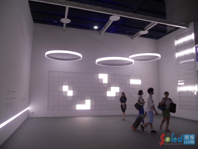 塊無邊框的是一個LED發(fā)光面板,可以用于一些室內的場所,如家居商業(yè)的地面、發(fā)光墻,也可以做成一個發(fā)光頂棚。這種跳躍式的設定可以給予我們多多少少遐想的空間,也可以自由組合形式。設計師可以根據他的要求把我們的這種產品應用各種形式,它的色溫也是可以改變的。它的作用在于讓整個墻一起形成跳躍性變幻的畫面,營造氣氛。”光亞展上,歐普照明的設計師江楠楠小姐向搜搜LED網記者介紹。
