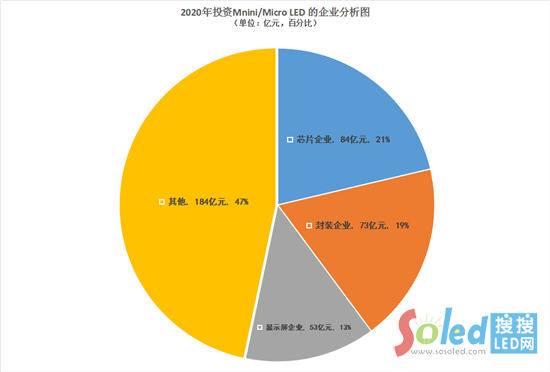 從統(tǒng)計數(shù)據(jù)的信息來看,2020年投資Mini/Micro LED企業(yè)有27家,其中芯片企業(yè)(6家),包括晶電、三安光電、兆馳股份、華燦光電、乾照光電、聚燦光電,總投資約為84億元,占總比約為21%;封裝企業(yè)(4家),包括東貝、鴻利智匯、國星光電、木林森,總投資為73億元,占總比為19%;顯示屏企業(yè)(8家),包括洲明、雷曼光電、維信諾、瑞豐光電、億光、深德彩、利亞德、隆利科技,總投資約為53億元,占總比為13%;其他企業(yè),包括錼創(chuàng)(臺企)、惠特(臺企)、Aledia、北大青鳥、三星、蘋果, 以及檢測設備公司1家(精測電子)、新創(chuàng)企業(yè)1家(思坦科技)、面板廠家TCL華星,總投資額184億元,總占比為47%。