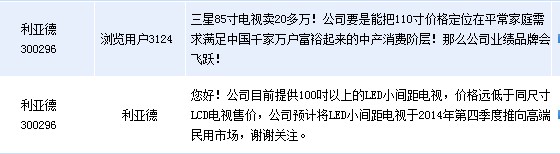 利亞德(300296)周一在全景網(wǎng)互動(dòng)平臺(tái)透露,公司目前提供100吋以上的